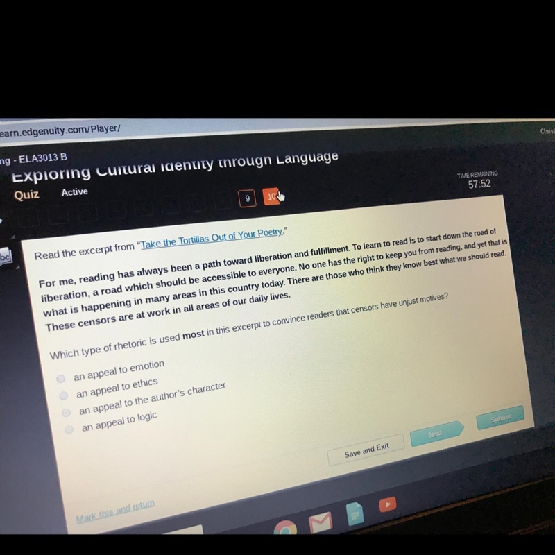 To convince readers that censors have unjust motives, the author uses rhetoric to appeal mostly to A. logic B.characters c.ethics d.emotions