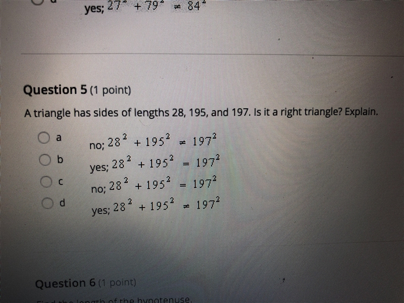 A triangle has sides of lengths 28, 195, and 197. Is it a right triangle?