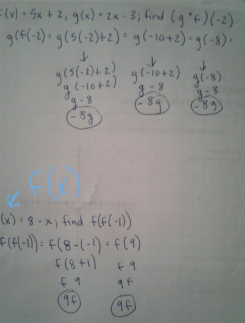 you're on the right track! g(f(x)) means that g's x is equal to the function f, in which you would plug in the answer for f (or equation in some cases) and that would be the x term of g. g(f(x)) or (g°f) can be said as "g composed of f"