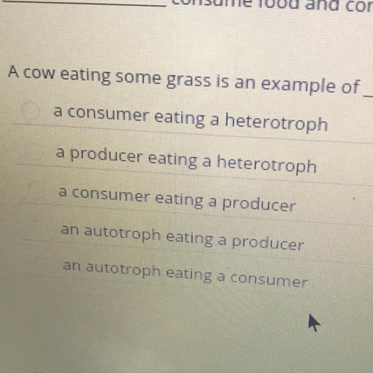 consumer eating a producer because plants ie grass create their own food from sunlight and cows consume nutrients through food - the grass