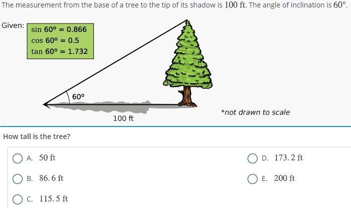 A building that is 100ft tall casts a shadow that makes a 30 degree angle with the ground. Approximately how long, in feet, is the shadow across the ground A.)0.01 B.)3.33 C.)15.61 D.)173.21