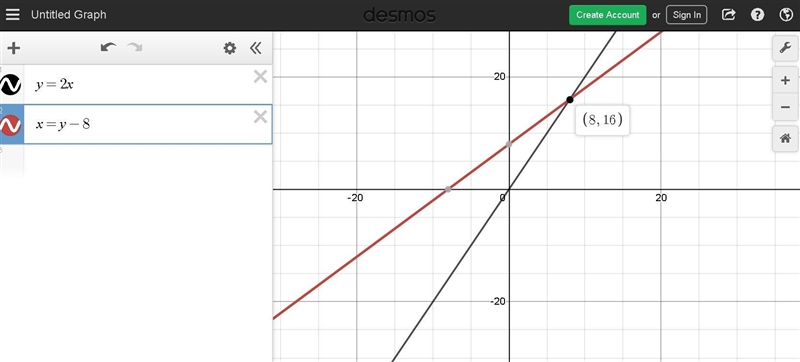The solution is the point (8,16)