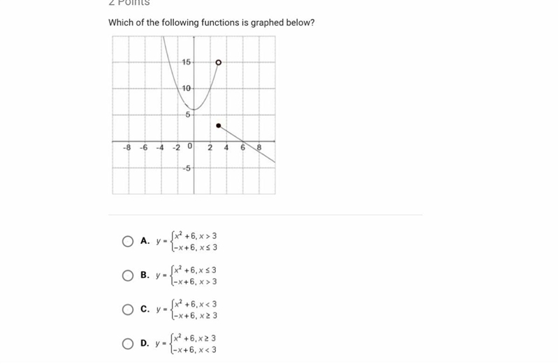 x² + 6 is graphed like a normal parabola (u shaped graph) with an open circle on (3,15). the x coordinate is whats important here, which is 3. we see that there are no values to the right of 3, and only to the left of 3. we can say that the statement x < 3 is true of the parabola, as any value less than 3 is a solution to the parabola.