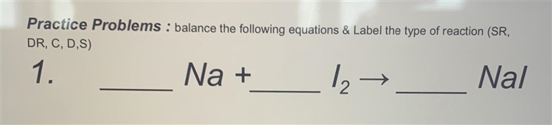 2Na + I₂ → 2NaI. "Synthesis reaction"