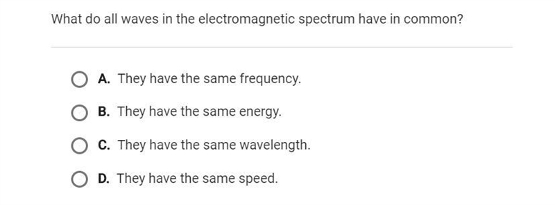 Speed because all waves in the electromagnetic spectrum travel at the speed of light