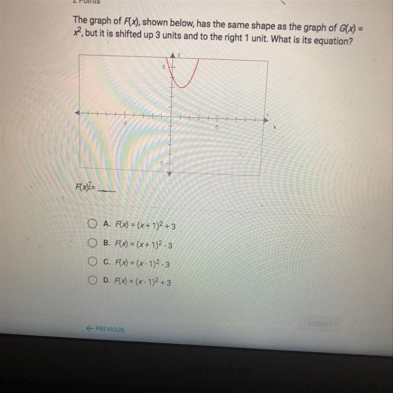 The graph of f(x), shown below, has the same shape as the graph of g(x)=x^2, but it is shifted up 3 units and to the right 1 unit. what is its equation??