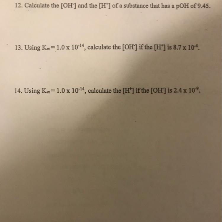 13. [OH-] = Kw/ (8.7 x 10^-4) = 1.1 x 10^-11