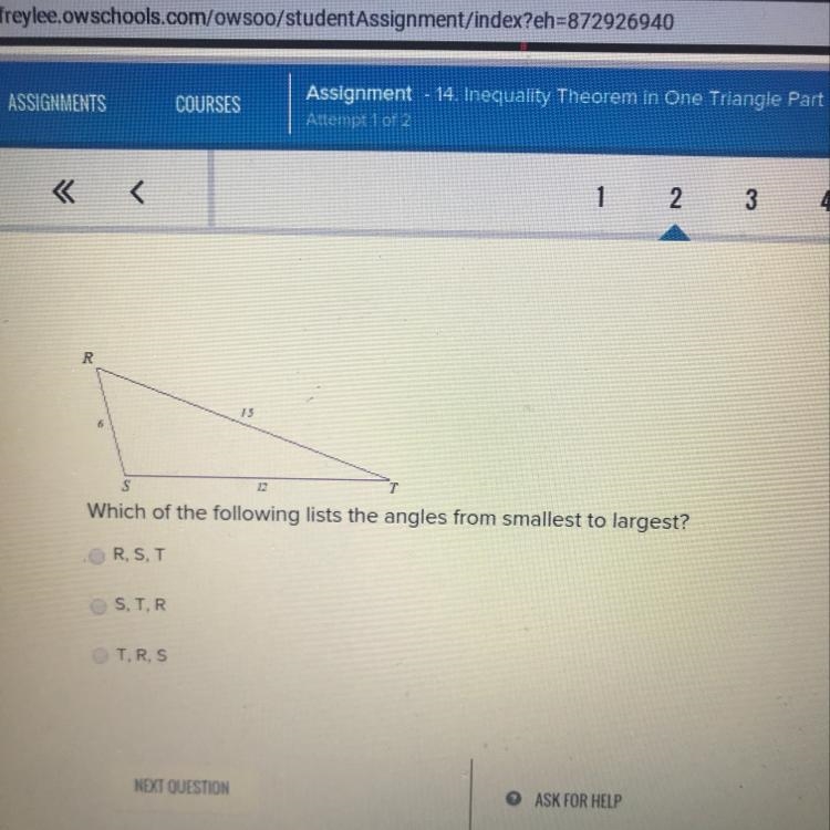Which of the following lists the angles from smallest to largest? ORST STR. OTRS