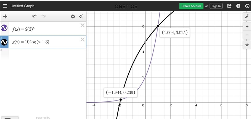 The intersection points are (-1.9,0.2) and (1,6)