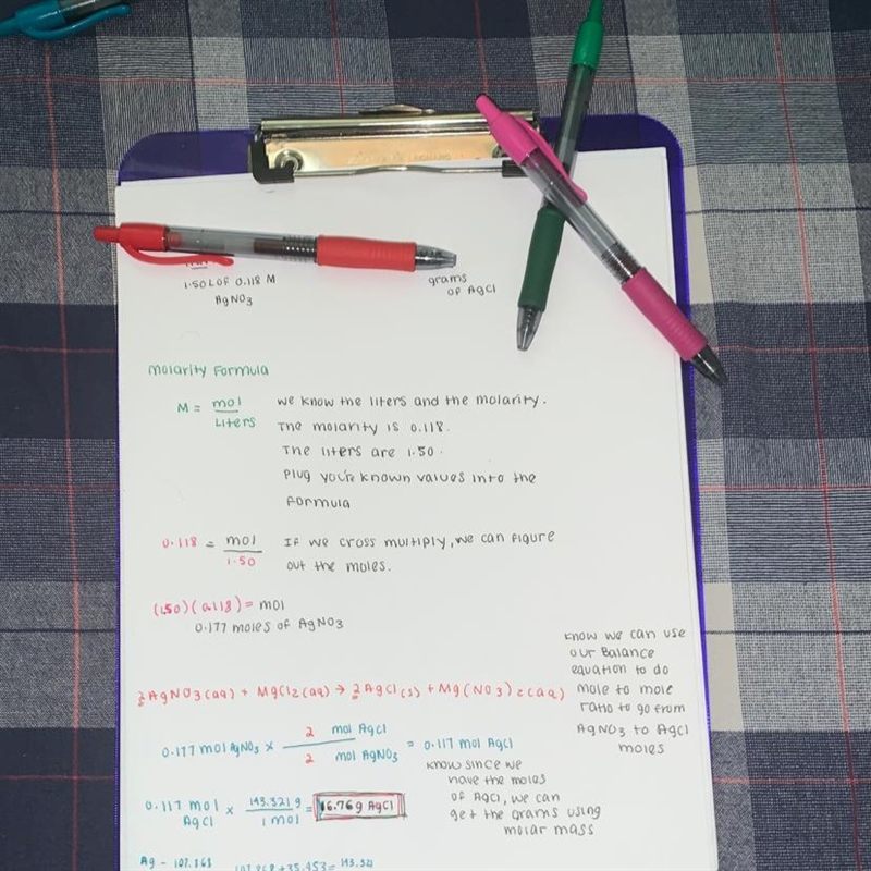 When solutions of silver nitrate and magnesium chloride are mixed, silver chloride precipitates out of solution according to the equation 2AgNO3(aq)+MgCl2(aq)→2AgCl(s)+Mg(NO3)2(aq) What mass of silver chloride can be produced from 1.50 L of a 0.118 M solution of silver nitrate?