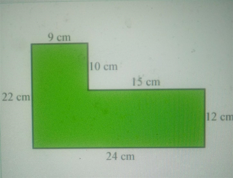 Step-by-step explanation: The first step is to divide this shape into multiple other shapes. First, let's start with the smaller rectangle. It has a height of 10 centimeters and a width of 9 centimeters, giving us 90 centimeters in total.