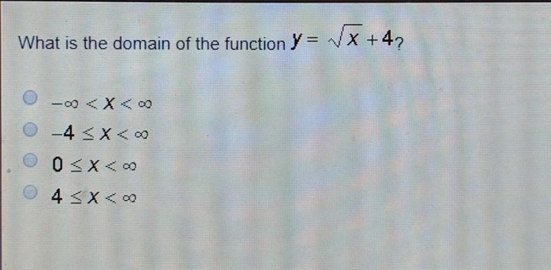 0 <x< infinity. because the range is 4 to infinity that means I goes also for 0