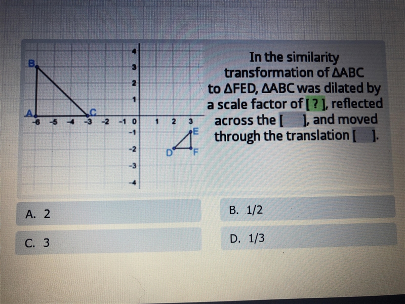 The length AC is 3, but the corresponding length FD is 1, so the dilation factor is FD/AC = 1/3.
