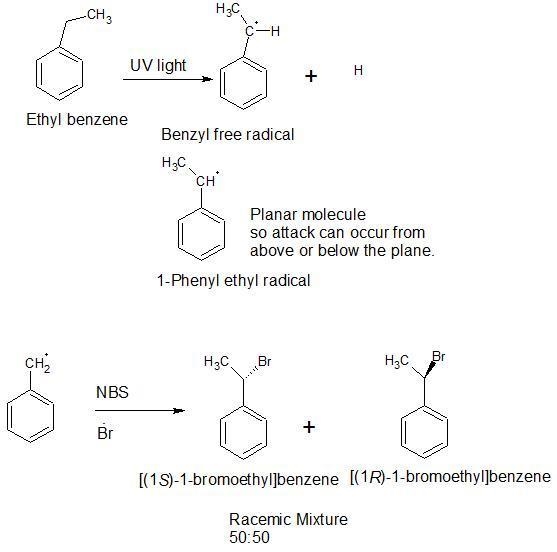 Since 1- Phenyl ethyl free radical has a trigonal planar geometry so it is a planar molecule which has two faces and hence the radical recombination with bromine free radical can occur with either of the two faces available.