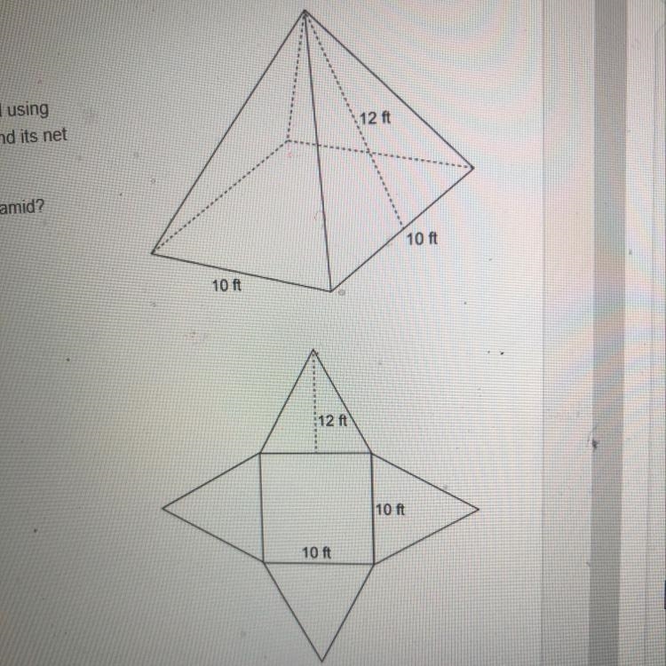 In this diagram, the base edge length is 10 ft and the height of the square pyramid is 12 ft. Substitute these values into the formula to find the surface area.