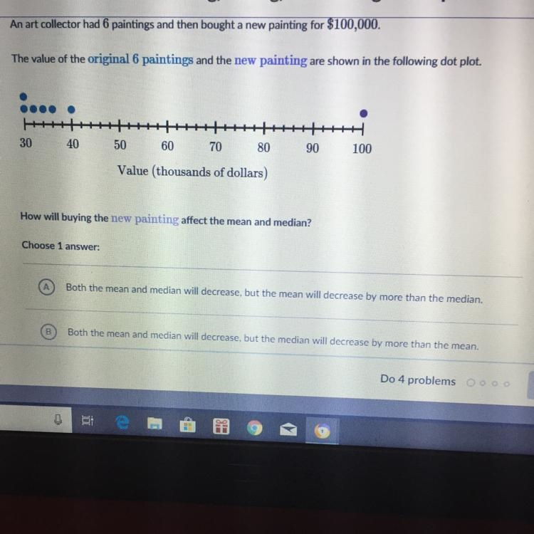 if you add a $100,000 painting to the plot, it will increase both since it is on the higher side of the plot. but the mean won't change nearly as much as the median because the painting is on the maximum side of the line plot.