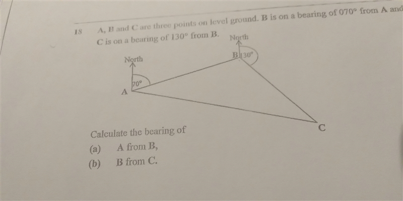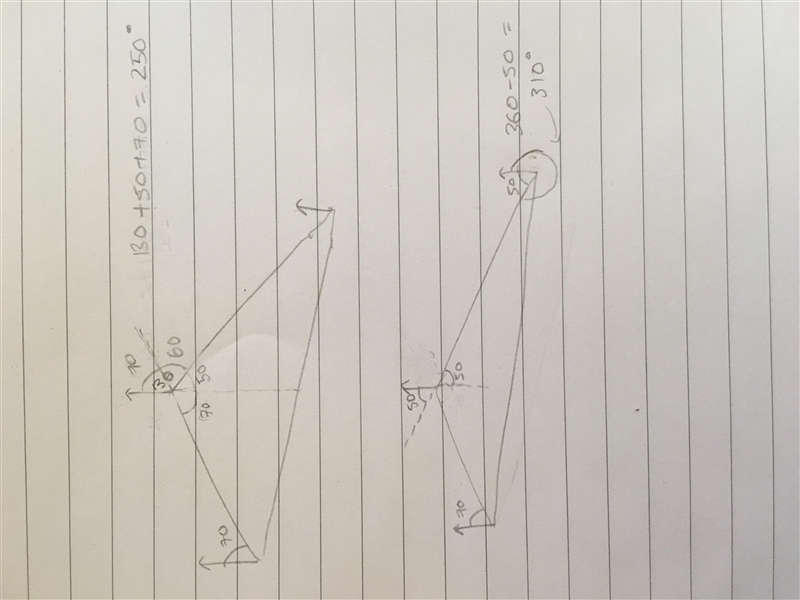 Now we add these angles up: 130 + 50 + 70 = 250º and this is the bearing to A from B.
