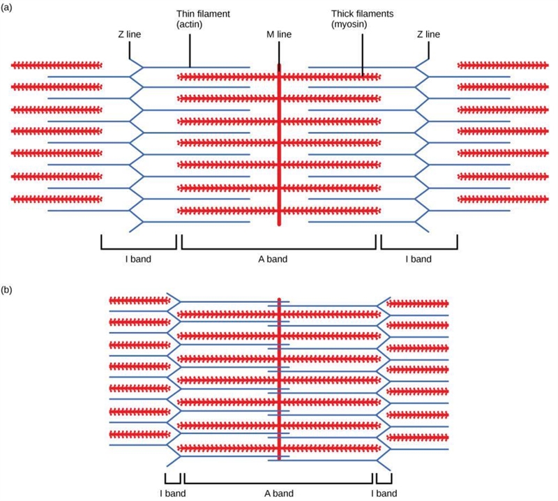 - A band or anisotropic band: It contains both mysoin and actin filaments. It has a central H band where only thick filament i.e myosin is present and an O band which is overlapping of both actin and myosin. During contraction O band increase and H band reduces in its length. At the center of H band there is the M line.