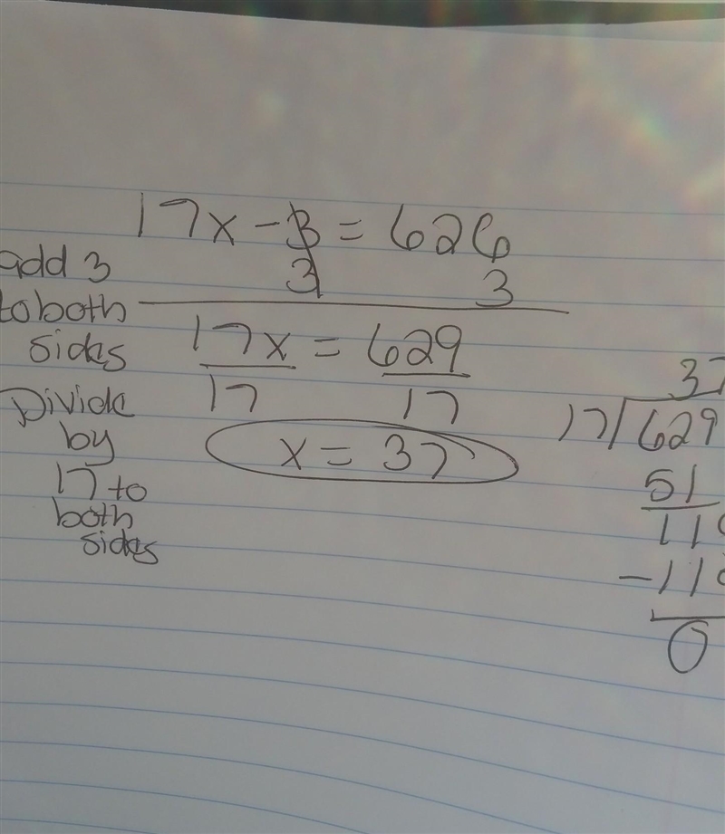 3) 17x - 3 = 626 can yall show me all the steps of how yall did it plz