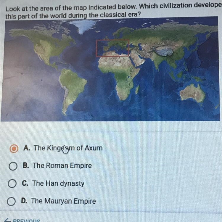 Protest: Unil TPoint Look at the area of the map indicated below. Which civilization developed in this part of the world during the classical era? O A. The Kingdom of Axum O B. …