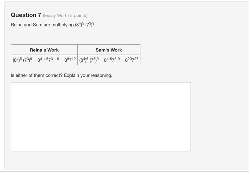 Reina and Sam are multiplying (84)5 (73)9. Reina's Work Sam's Work (84)5 (73)9 = 84 + 573 + 9 = 89712 (84)5 (73)9 = 84⋅573⋅9 = 820727 Is either of them correct? Explain your reasoning.
