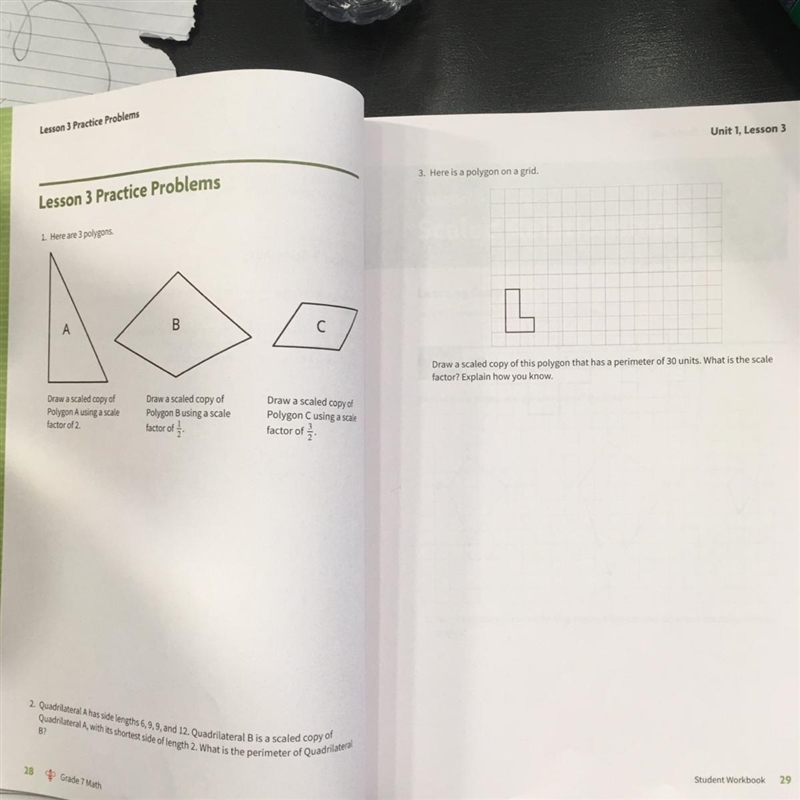 For the first one it looks like you are just going to have to measure sides and angles and then draw shapes that have the same angle measures, but however longer or shorter it tells you. So for the right triangle A it says a scale factor of 2 so each side length is going to be double what the original is, shape B will be redrawn with half the lengths and shape C will be redrawn with the lengths multiplied by 3/2, or 1.5. Again though, angle measures stay the same.
