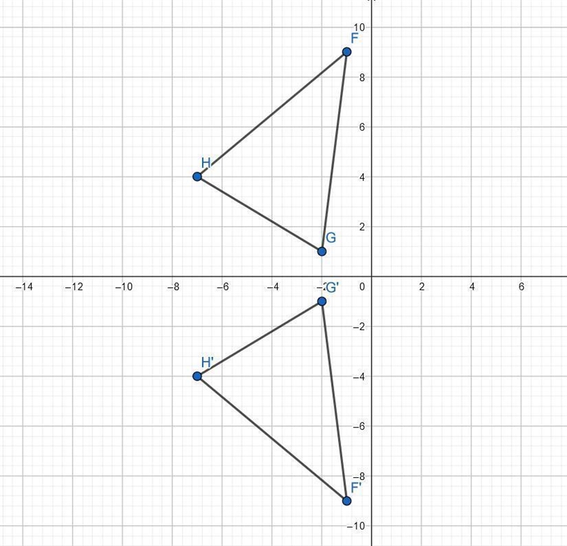 You are given a triangle with vertices F(-1,9), G(-2, 1), and H(-7, 4). After reflection the vertices of new triangle F'G'H' will have coordinates