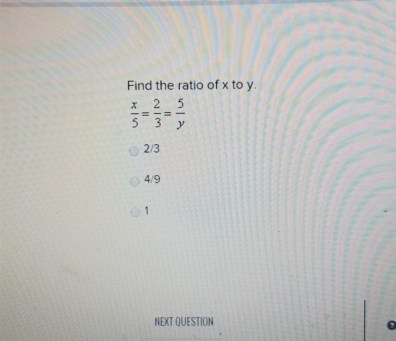 To find the answer you would need to find the values of x and y. Using the given information you know x/5 is equal to 2/3. Then you would cross multiply and divide in order to fine the value of x, which is 10/3. Doing the same thing to find y, which would be 15/2. Since it’s day the ratio of x and y. You would divide the value of x by y to get your answer of 4/9.