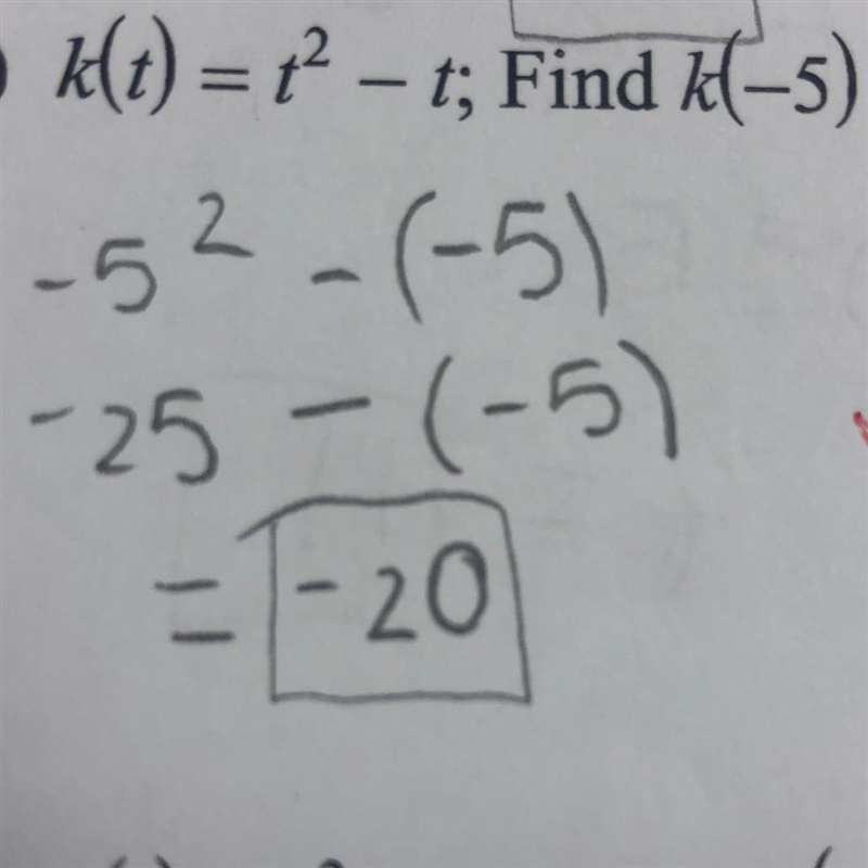 you plugged in your -5 correctly but when you multiply a - number to a exponent it will be positive so it is positive 25 - -5 so then it would be 30