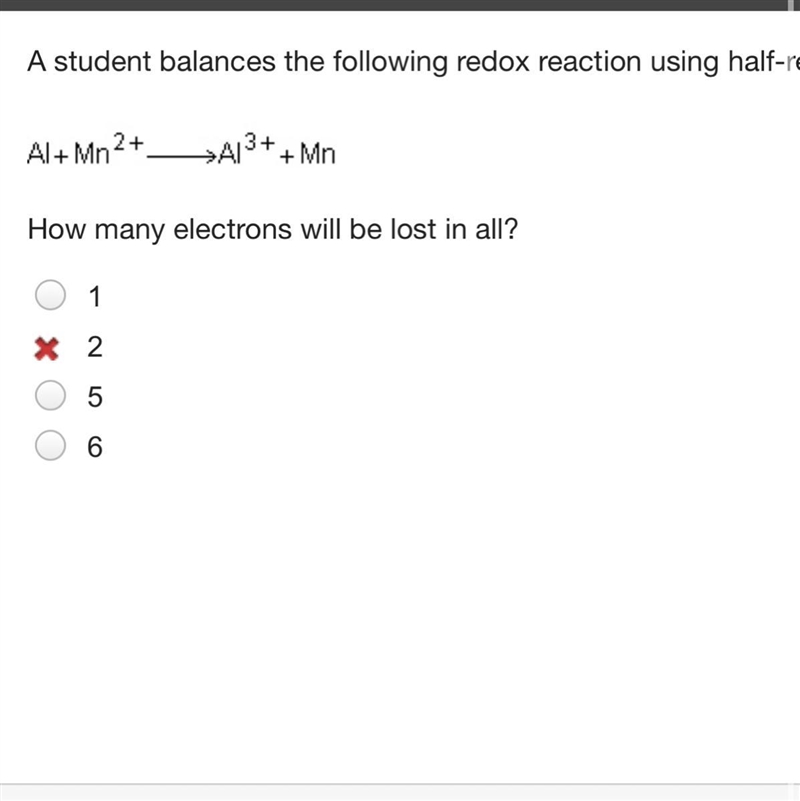 A student balances the following redox reaction using half-reactions. How many electrons will be lost in all? 1 2 5 6