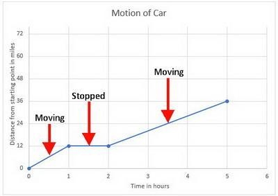 For example, between hours 1 and 2, the distance travelled stays the same at 12 mi.