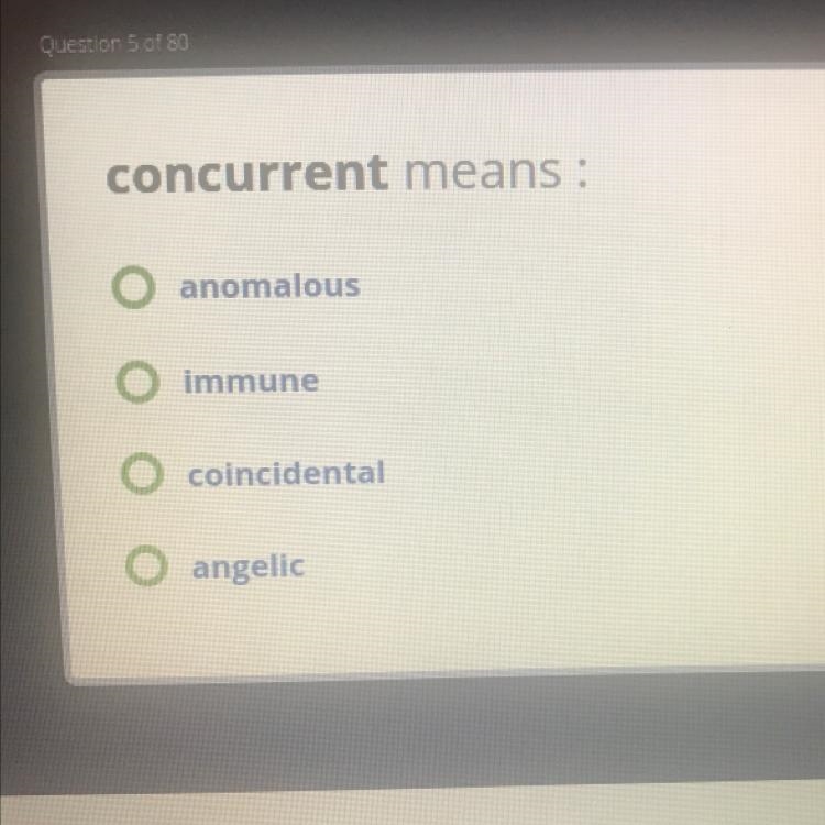 Concurrent means : A. anomalous B. immune C. coincidental D.Angelic