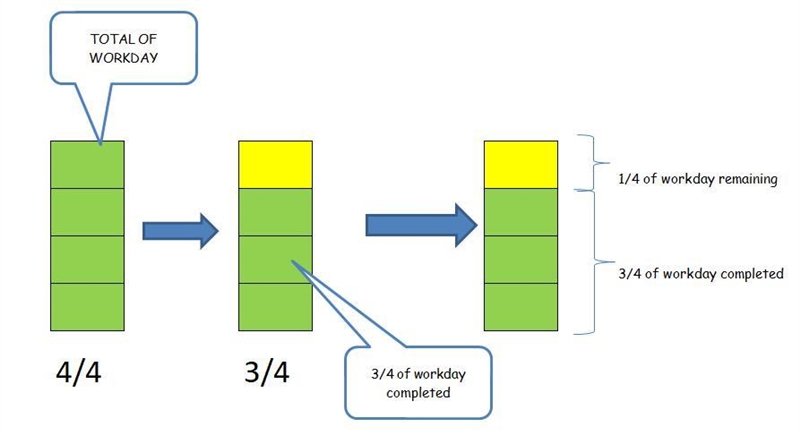 In the second figure you can see in green marked the portions of workday worked, as it is 3/4 it means 3 portions of a total of 4. So, one portion is left, that is marked in yellow color. One portion of a total of 4 portions, it means 1/4.