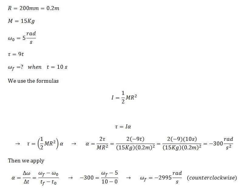 A circular disc with a radius of gyration of 200 mm and a mass of 15 kg is rotating in the clockwise direction with an angular velocity of 5 radians per second. From the time t=0 seconds if the disc is subjected to a counterclockwise moment of 9t, where t is the time in seconds, deternmine the direction and magnitude of angular velocity of the disc at time t=10 seconds.