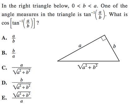 The angle with tangent a/b is the one at lower right. "a" is the side opposite that angle, and "b" is the side adjacent to it. The cosine of that angle will be the adjacent side divided by the hypotenuse: