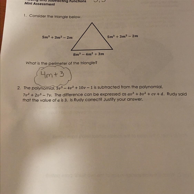 The polynomial 5v³ - 4v² + 10v -1 is subtracted from 7v² + 2v³ -7v