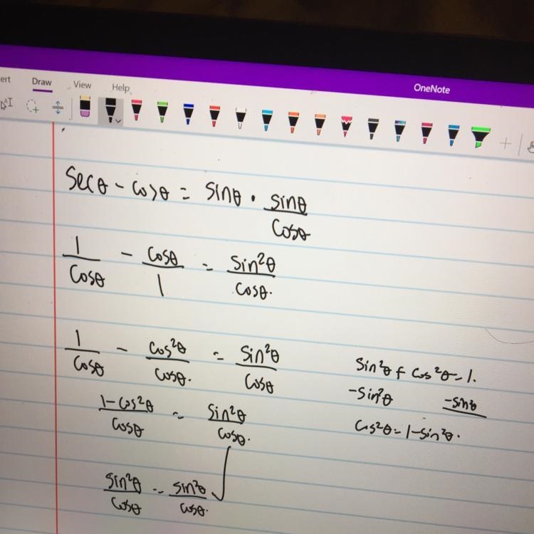 Sec(theta)-cos(theta)=sin(theta)((tan(theta))