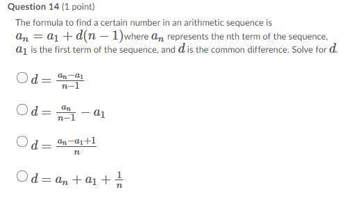 (Please Help!) The formula to find a certain number in an arithmetic sequence is an=a1+d(n−1) where an represents the nth term of the sequence, a1 is the first term of the sequence, and d is the common difference. Solve for d.