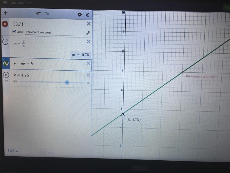 y= 3/4x + 4.75 <= this is the line that passes through the point (3, 7) with a 3/4 slope.