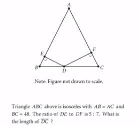 triangle ABC above is isosceles with AB=AC and BC =48. the ratio of DE is 5:7. what is the length of DC