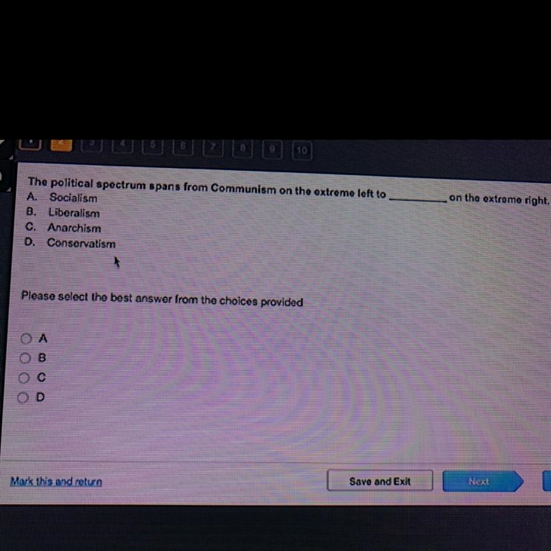 The political spectrum spans from communism on the extreme left to: a. Socialism b. Liberalism c. Anarchism d. Conservatism