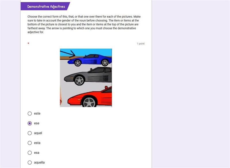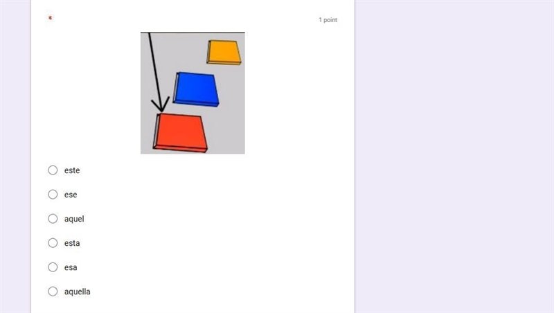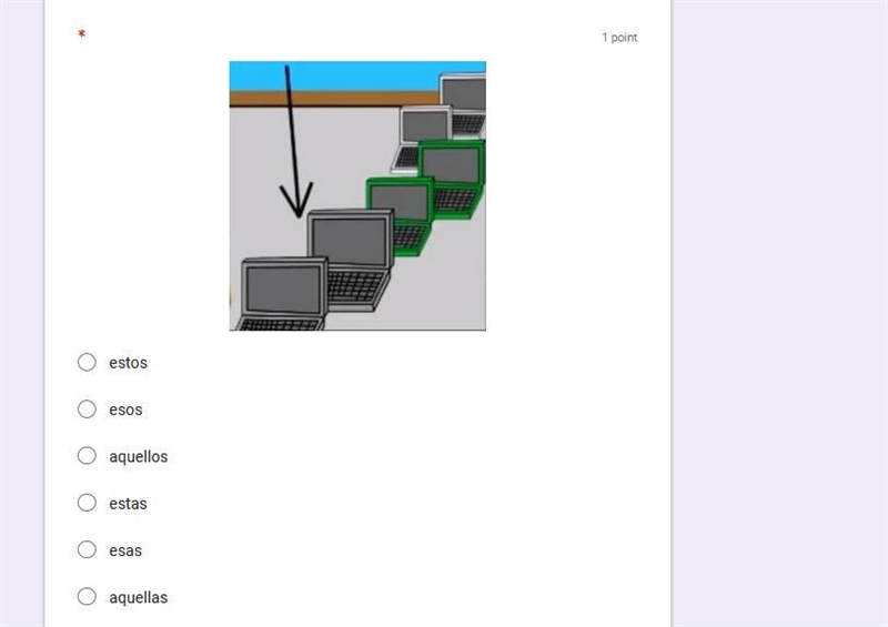 Choose the correct form of this, that, or that one over there for each of the pictures. Make sure to take in account the gender of the noun before choosing. The item or items at the bottom of the picture is closest to you and the item or items at the top of the picture are farthest away. The arrow is pointing to which one you must choose the demonstrative adjective for. PLEASE HELPPPP