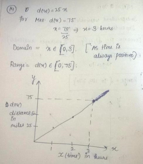 A charter boat travels at a maximum rate of 25 miles per hour. The function d(x) = 25x represents the distance d(x), in miles, that the boat can travel in x hours. The charter boat travels a maximum distance of 75 miles from the shore. Find a reasonable domain and range for this function?