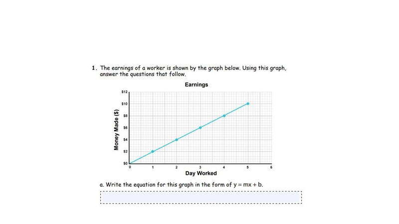 This is because the distance over the money made over the days worked is 2/2 which simplifies to 1 so that would be the one x. then the y intercept is found on the y axis where does the line cross the y axis? this would be at zero so you do not need to put that in the equation
