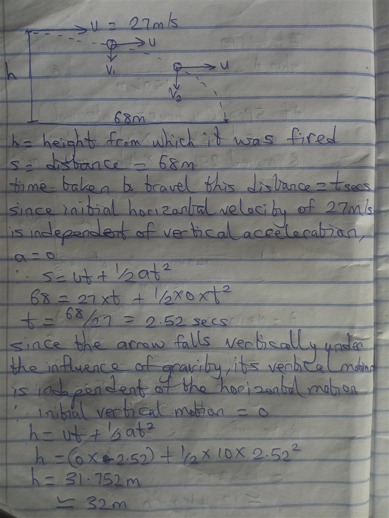 An arrow fired horizontally at 27m/s travels 68m horizontally before it hits the ground. From what height was it fired?