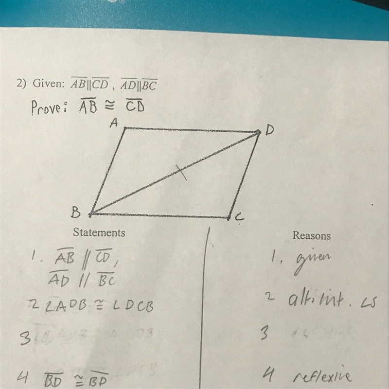 The two column proof has shown that AB ≅ CD because of CPCTC