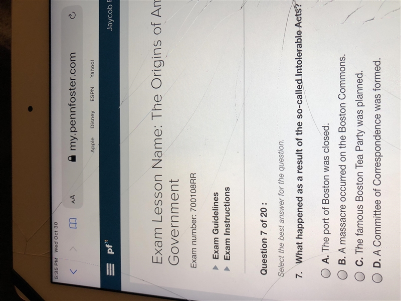 I think it is B because the Intolerable Acts were after the Boston Tea party. The Intolerable acts were a British parliament punishment to the colonies.