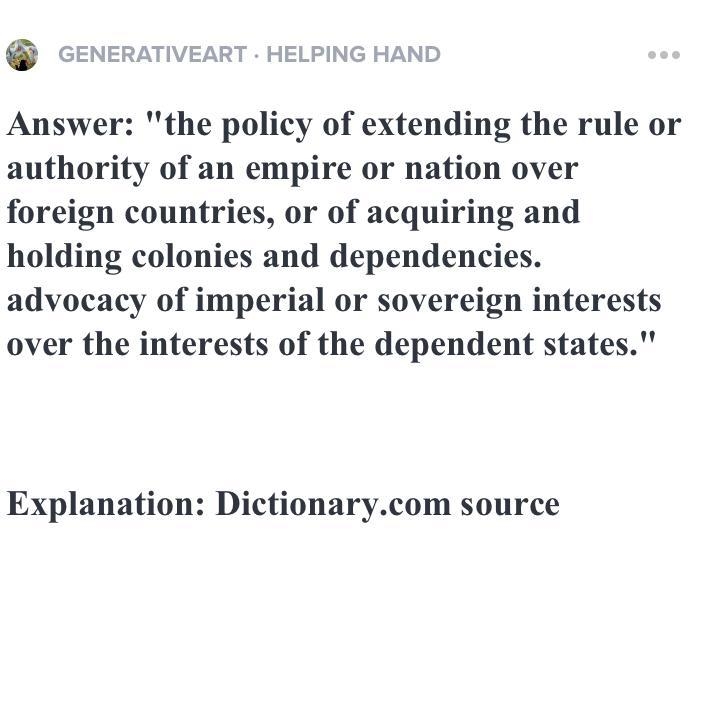 Answer: "the policy of extending the rule or authority of an empire or nation over foreign countries, or of acquiring and holding colonies and dependencies. advocacy of imperial or sovereign interests over the interests of the dependent states."