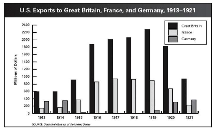 The bar graph shows the value of U.S exports to Great Britain, France, and Germany between 1913 and 1921.