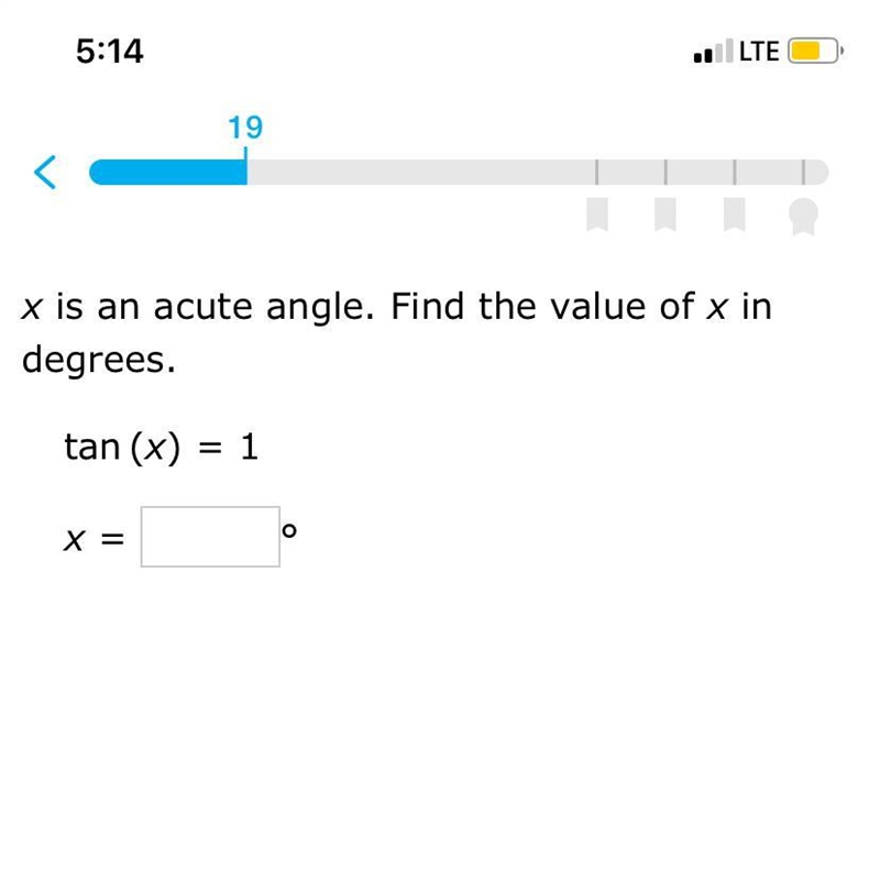 X is an acute angle.Find the value of x in degrees Tan(x)=1